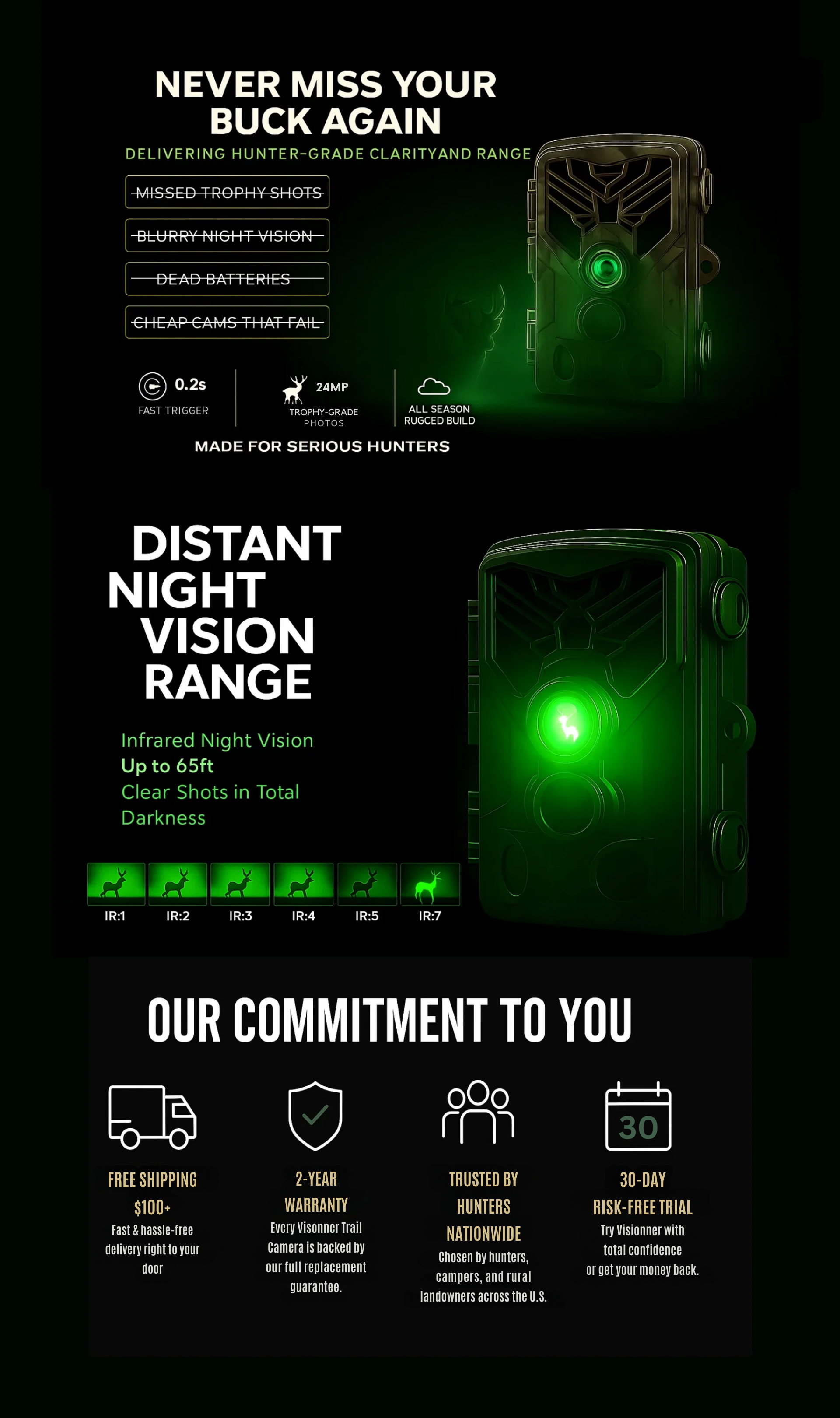 Set up your Visonner WiFi Trail Camera for 30 full days. Strap it to your tree, track your hit list buck, or keep watch over your land. If you’re not absolutely blown away by the crystal-clear photos, fast trigger speed, and instant phone access — send it back.