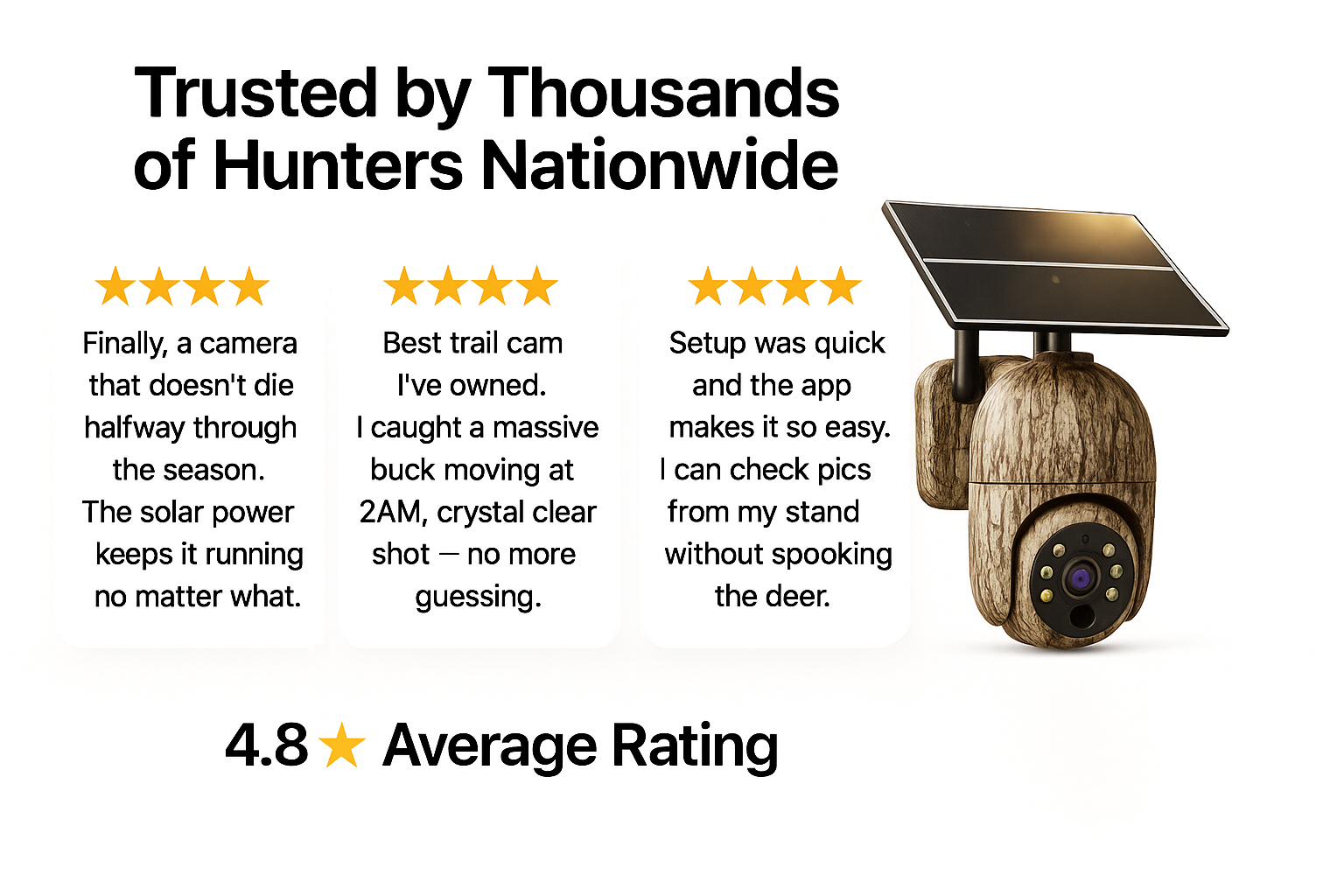 “I was ready to return it the first week, thinking it was another knockoff. Three months later, it’s caught every deer on my land — including my #1 buck. Best cam I’ve ever owned.” – Jason R., Missouri
